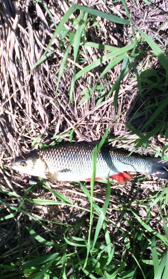 Всем привет!!! Сегодня вместе с отцом решили выдвинуться на незнакомый нам водоём. Это бывший карьер, но сейчас он заполнен водой. Недалеко находится Ока, практически рядом. Видимо во время весеннего половодья он заполнился водой. Отец собирался половить карасей на карьере, а я взял с собой спин. Выехали в пять утра. Дорога конечно ужас. Ехали всё время почти на второй передаче, но наконец добрались до нужного нам места.На дорогу ушло полтора часа, а может и больше. Отец остался на карьере, а я выдвинулся на Оку. Берег высокий и сильно заросший, крапива выше человека.Пришлось полазить,пока не нашёл относительно мелководный и длинный перекат. С моей стороны шла мель, а с противоположной небольшая глубина и деревья по всему берегу. Ловил на воблеры. Проводку делал вдоль деревьев с последующим выходом воблера на центр переката. Перекат мне понравился. В итоге было выловлено семь голавлей. Шесть из семи были пойманы, когда приманка проходила вдоль берега. Мелочь не попадалась. Оказывается, что на карьере тоже есть хищник. Это сказали другие рыбаки, которые там были.
