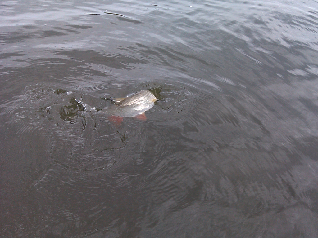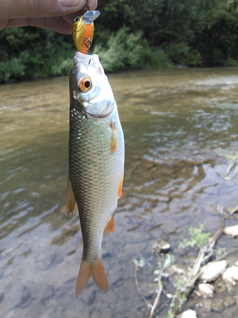 Итак, приехал после обеда в начало четвертого, расчехлился и к воде. Буквально через десяток забросов вешаю камиончик магнум на дерево и технично его отрываю. Глянул в коробку, а он последний. Ну что же, будем подбирать другие воблера. Перебираю приманки, а поклевок практически нет. И хиккори, и риджики и гризерки... как-то не интересуют красноперую рыбу. Ставлю секси минноу и первая поклевка - голавлик грамм на 250, потом еще, но как-то не так активно, как в прошлый раз. Хожу, ищу, думаю... и главное прячусь от рыбы. Очередная проводка и голавлик грамм на 700-800 позарился на такой мелкий воблерок. Иду выше по течению, на перекате снимаю еще нескольких, но размер все тот же -250-300гр.