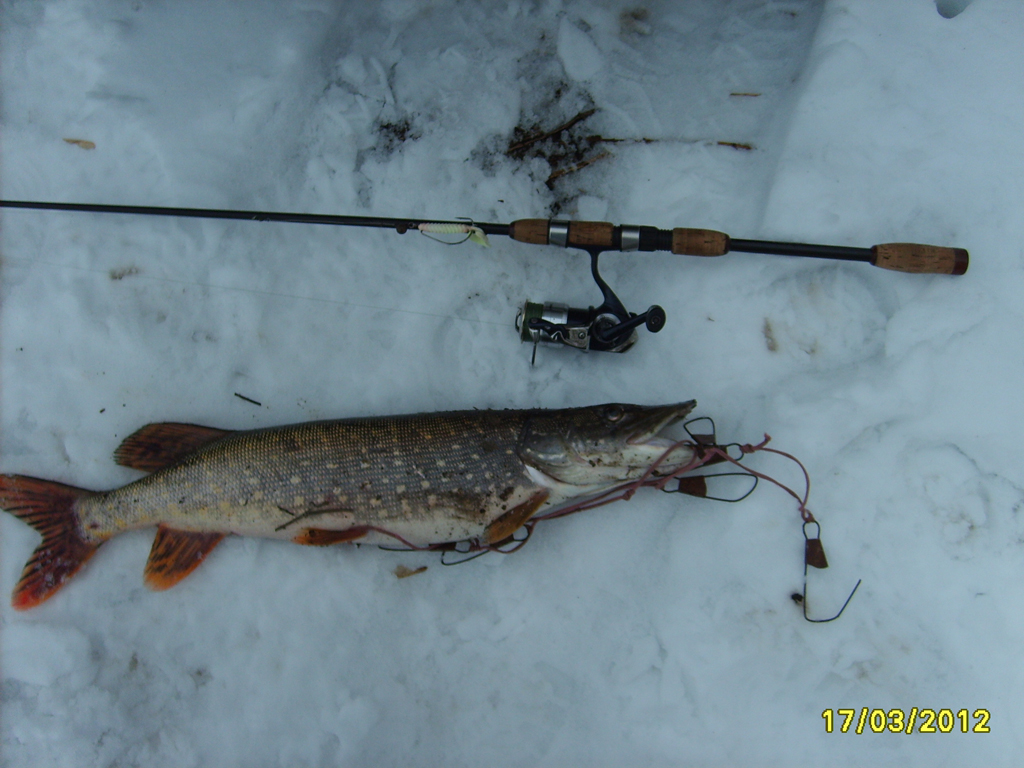 В-общем, по приезду отправились на самую дальнюю точку, чтобы постепенно двигаться к машине. Ходьба по снегу, проваливаясь по колено, несколько остудила наш пыл, но все-таки превозмогая усталость (кто так ходил, тот поймет), мы дошли до намеченной дальней точки. Через десяток забросов Димка снимает щучку под кило, через 15 метров у меня зубастая грызет мандулу, отгрызая от неё кусок, но так и не засёкшись.
