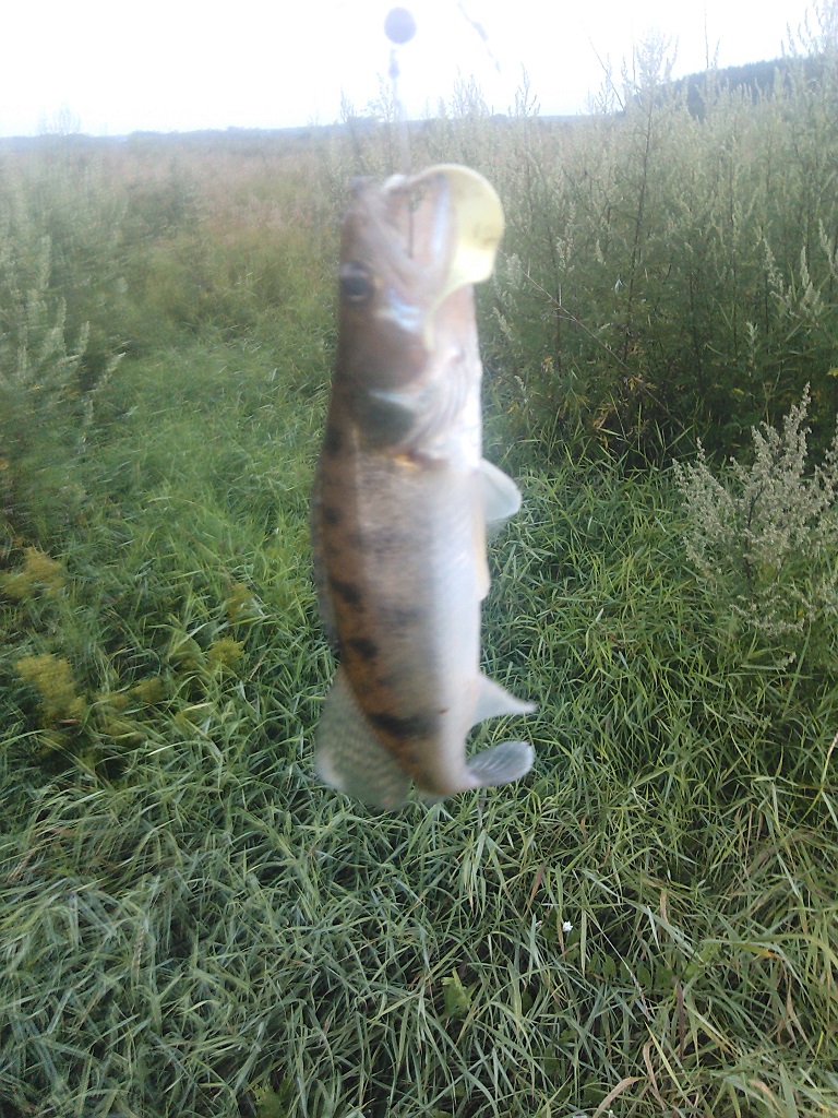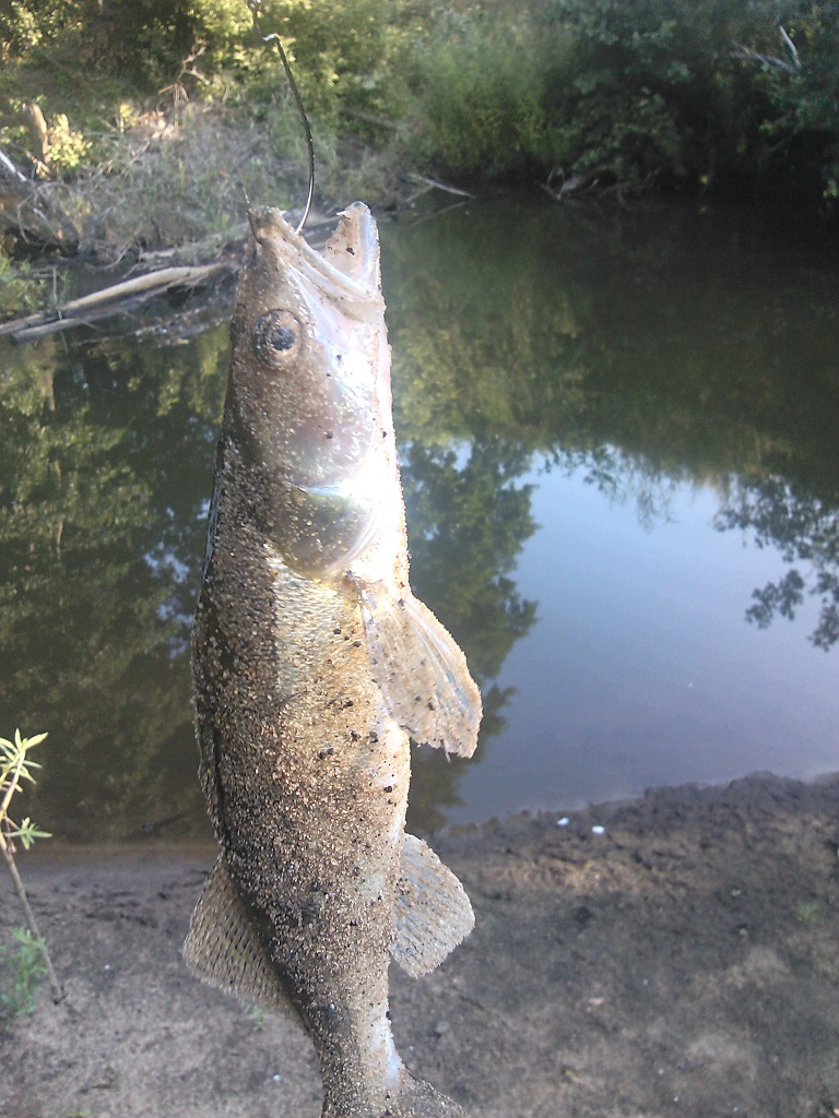 Раннее утро, воды в реке практически нет (хз... либо засуха, либо ремонт набережной). В-общем, не доставая камеру из машины, делаю первый заброс и на первой же проводке чёткий "бумс!!!" и наш любимый Орловский размер представителя окунёвых в судачьем обличии красуется на фоне июльского утра. Иду к машине, беру камеру и фоткаю. Потом было лень камеру таскать и фоткал на телефон.